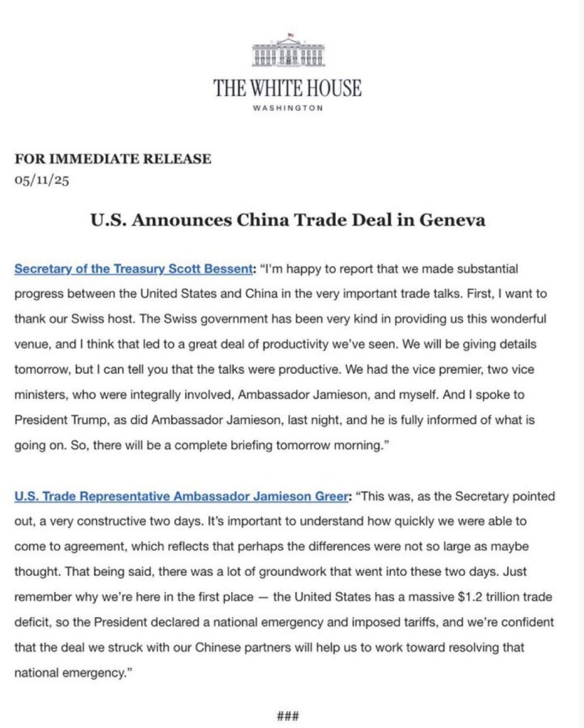 अमेरिकी ट्रेजरी सचिव स्कॉट बेसेन्ट और व्यापार प्रतिनिधि जेमिसन ग्रीर ने चीन और अमेरिका के बीच व्यापार समझौते की जानकारी दी। जिनेवा में दो दिनों की उच्च स्तरीय बातों के बाद यह समझौता हुआ है। इस वार्ता में दोनों देशों के बड़े अधिकारी शामिल हुए। जिसमें बढ़ते व्यापार घाटे और वास्तविक व्यापार युद्ध के कारण उत्पन्न हुए तनाव को कम करने के प्रयास पर बातचीत की गई।
