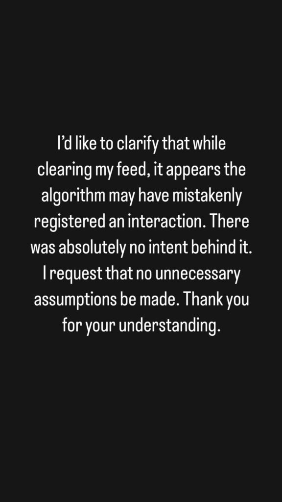 विराट कोहली ने अपने इंस्टाग्राम पोस्ट में कहा, “मैं यह स्पष्ट करना चाहता हूँ कि फीड क्लियर करते समय ऐसा लगता है कि एल्गोरिदम ने गलती से कोई इंटरैक्शन रजिस्टर कर लिया है।” मेरा कोई उद्देश्य नहीं था। मैं आपसे विनती करता हूँ कि बेवजह कोई भी काम नहीं करें। जानकारी देने के लिए धन्यवाद।