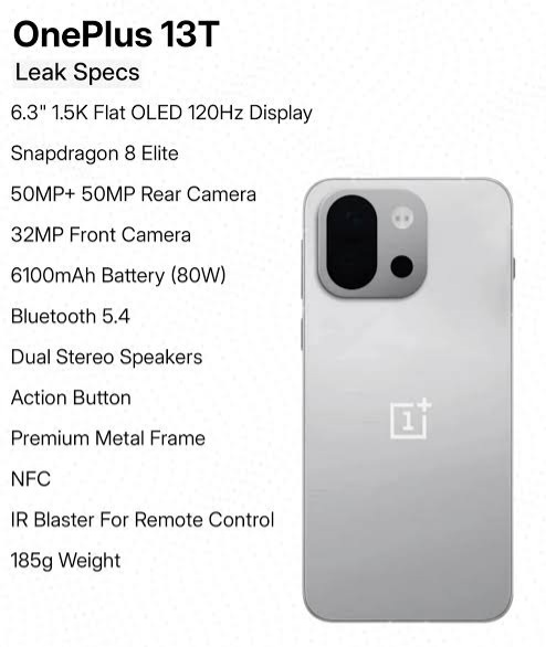 वनप्लस 13T, 120 Hz तक का अडैप्टिव रिफ्रेश रेट और 1,600 nits तक की ग्लोबल पीक ब्राइटनेस के साथ 6.32 इंच (1,264×2,640 पिक्सल) फुल-एचडी+ डिस्प्ले के साथ ColorOS 15.0 पर चलता है। मेटल फ्रेम है। 16GB तक LPDDR5X रैम और 1TB तक UFS 4.0 ऑनबोर्ड स्टोरेज वाले स्नैपड्रैगन 8 एलीट सोर्स पर काम करता है। हैंडसेट में दो रियर कैमरा हैं: एक 50-मेगापिक्सल सेंसर और एक 16-मेगापिक्सल सेल्फी शूटर।