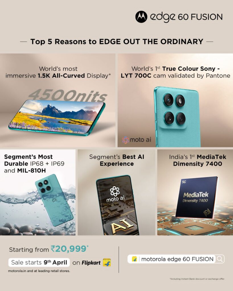 भारत में मोटोरोला का नया मिड-रेंजर फोन मोटो एज 60 फ्यूजन पहली बार लॉन्च हुआ है। इस स्मार्टफोन में कई विशेषताएं हैं। क्वाड-कर्व्ड AMOLED पैनल, क्योंकि अगर डिस्प्ले अच्छी हो तो फोन को चलाने में अच्छा एक्सपीरियंस मिलता हैं। मीडियाटेक डाइमेंशन प्रोसेसर, LPDDR4x रैम, मोटो AI फीचर्स और मिलिट्री-ग्रेड सर्टिफिकेशन इस फोन की ड्यूरेबिलिटी को बढ़ाते हैं। आपको मोटोरोला एज 60 फ्यूजन की कीमत, स्पेसिफिकेशन और फीचर्स के बारे में पूरी जानकारी देने के लिए तैयार हो जाओ।